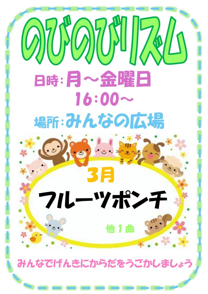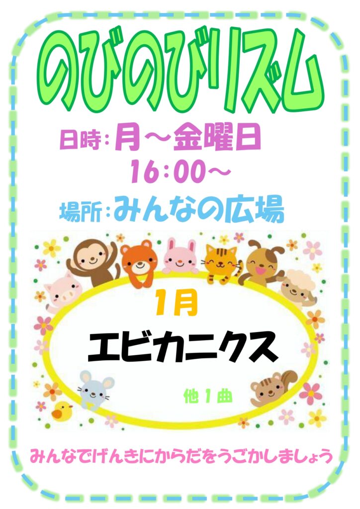 月~金曜日の16:00~ みんなのひろばでのびのびリズムを行います。
